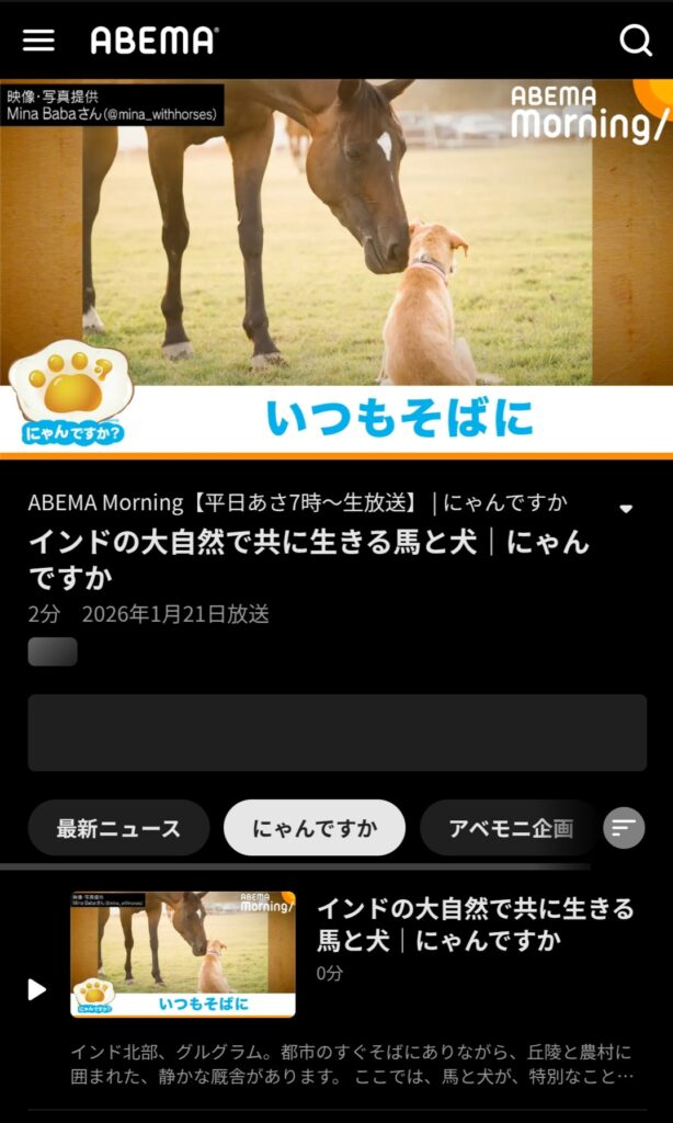 2026年1月21日(水)、日本時間7時〜と8時〜の2回配信される生放送のABEMA Morningで、『インドの大自然で共に生きる馬と犬』というテーマで、私の厩舎の馬と犬達の生活が紹介された。その内容をご紹介させて頂きます!